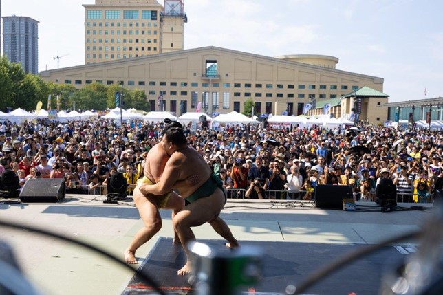 JAPAN FESTIVAL CANADA 2023では日本からも特別なゲストにご来場いただきました。特に、第69代横綱の白鵬氏(現宮城野親方)にお越しいただけましたのは、世界中のJapan Festivalとしても初のことでした。日本の相撲史に残る横綱である白鵬氏が直接外国を訪れ、相撲を伝えるということはこれまでも機会が少なく、その貴重な事例をカナダで提供できたことは大変名誉あることと感じております。ガラディナーではトークショーも開催しまして、日系コミュニティーの皆様には親方との触れ合いを楽しんでいただけたものと存じます。